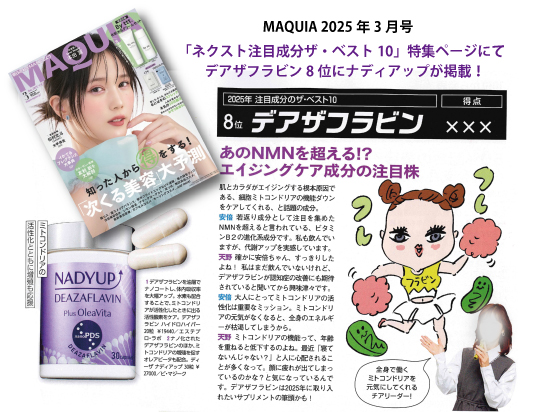 MAQUIA2025年3月号(2025年1月22日発売)の『ネクスト注目成分ザ・ベスト10』の」8位にデアザフラビンがランクインし、≪ナディアップ≫が紹介されました!